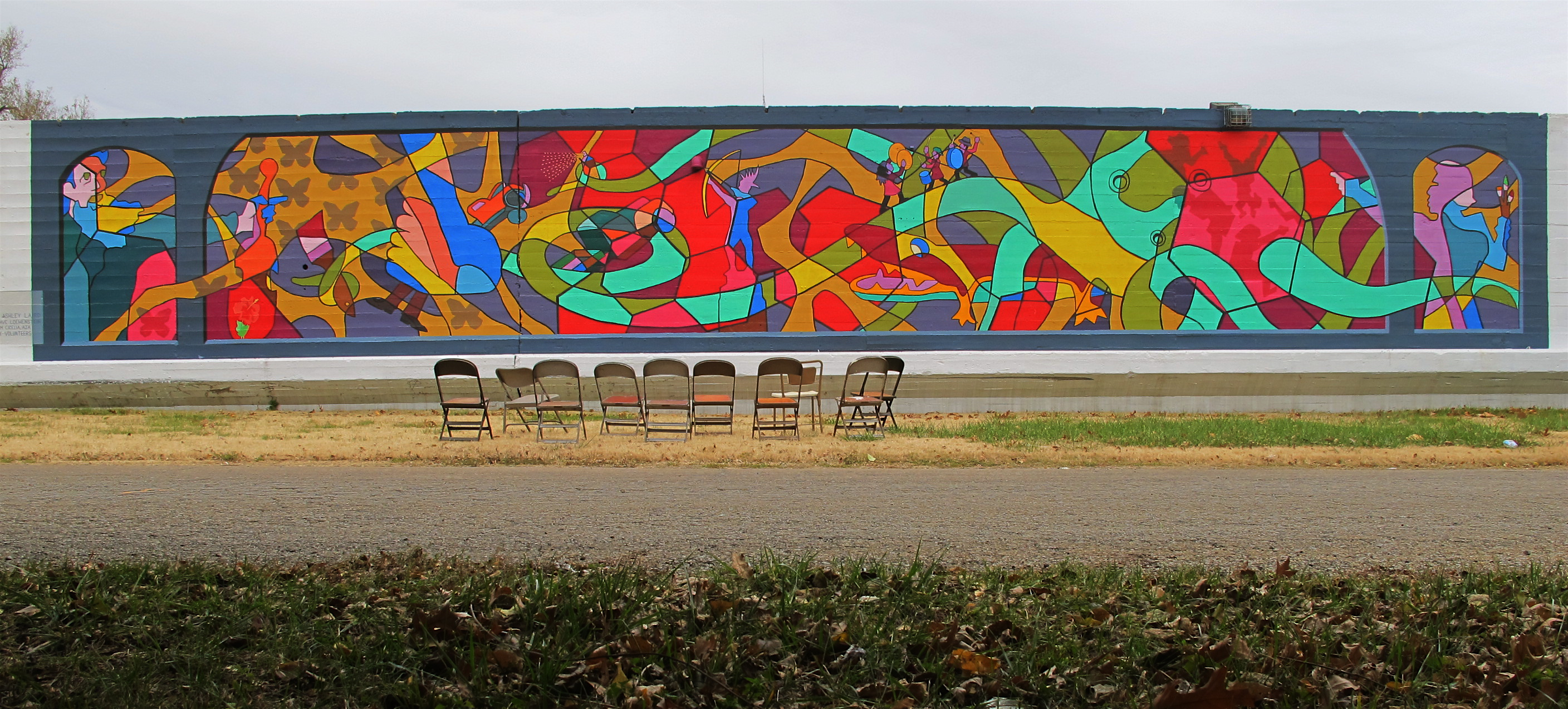With both recognizable and lesser-known references to Topeka artworks, this mural celebrates the heritage and continued vitality of Topeka’s creative community. The design explores the interweaving of molecular forces and synapses as a metaphor for the contagious spreading of art. As Topeka reflects on its rich history and continues to cultivate art in its community the desire and ability to create becomes more activated and alive.