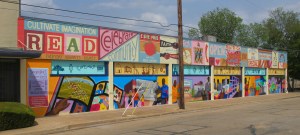Situated along Elm Avenue in historic East Waco, the library’s mural honors the legacy of this vibrant community. The mural design, built in three parts, begins with a series of panels along the bottom where Elm Avenue, Paul Quinn College, the Alpha Theater, Kermit Oliver, Doris Miller and Juneteenth are remembered. Above, a series of symbolic pictograms refer to East Waco’s cultural, geographic and economic life, while the top of the mural takes inspiration from the tradition of hand-painted signs popular here.
